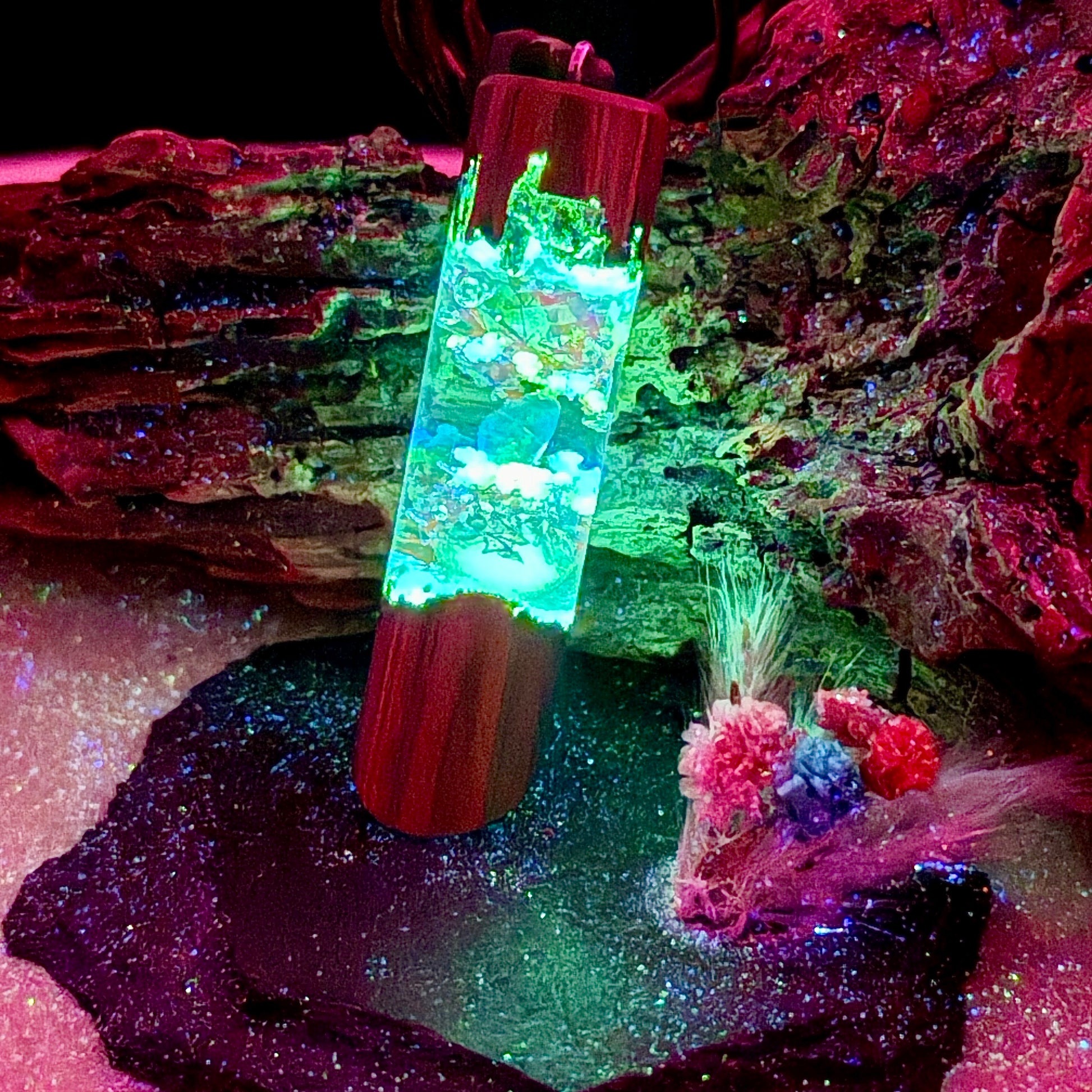 Der warme, dunkel gemaserte Santos Palisander bildet eine perfekte Grundlage für den schimmernden Purple Welo-Opal, der im Harz wie die Splitter einer geplatzten Meerjungfrau schwebt.